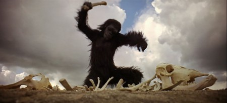 Under natten gör den svarta monoliten något med dem. Dem utvecklas och dem börjar nästa dag att upptäcka nya saker. En av aporna plockar up ett ben ifrån ett dött djur, och kan sedan använda benet som ett vapen.